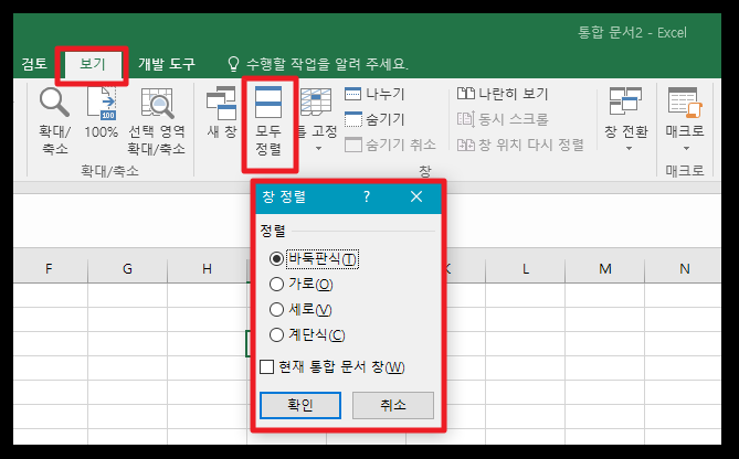 보기 탭 / 모두정렬 을 클릭하니다.