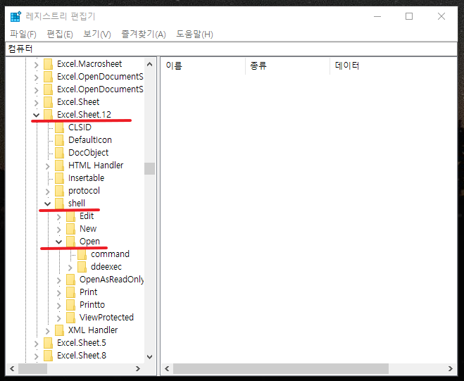 Excel.Sheet.12 / shell / Open 순서로 열어줍니다.