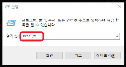 2. 실행창에 'excel /x' 라고 입력합니다.