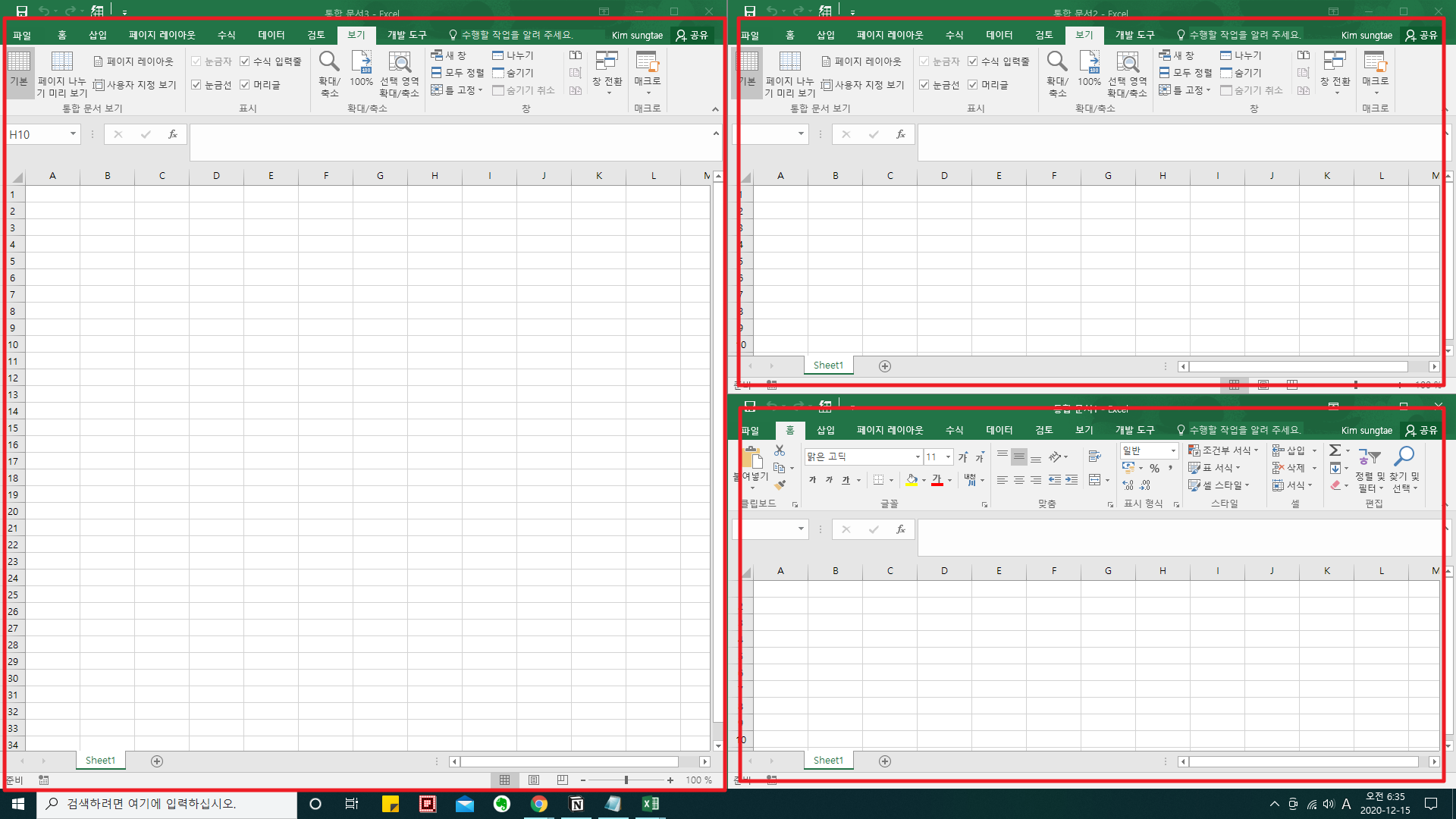 한 엑셀 창에서 여러 화면을 확인할 때 도움이 되는 방법입니다.