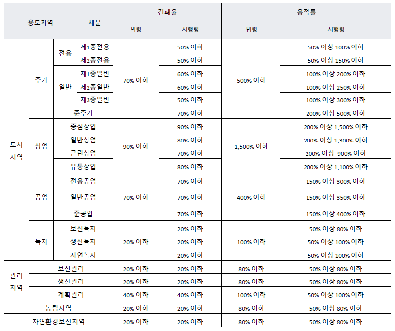 | 도시지역 | 주거지역 | 1종전용주거지역 | 50% 이하 | 50% 이상 100% 이하 |