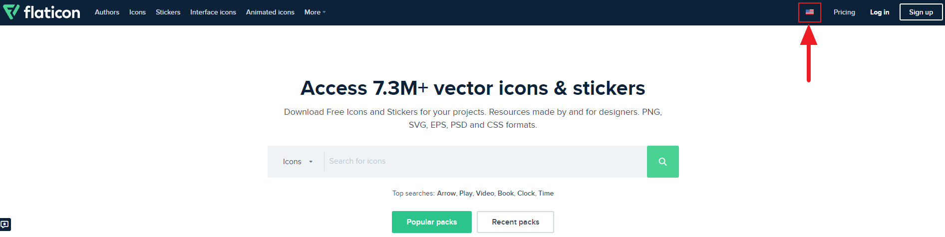 영문 사이트로 들어가셨다면 화살표에서 국가를 변경하실 수 있습니다. 픽토그램, 아이콘 등으로 PPT 꾸미는데 잘 활용하기 매우 좋습니다.